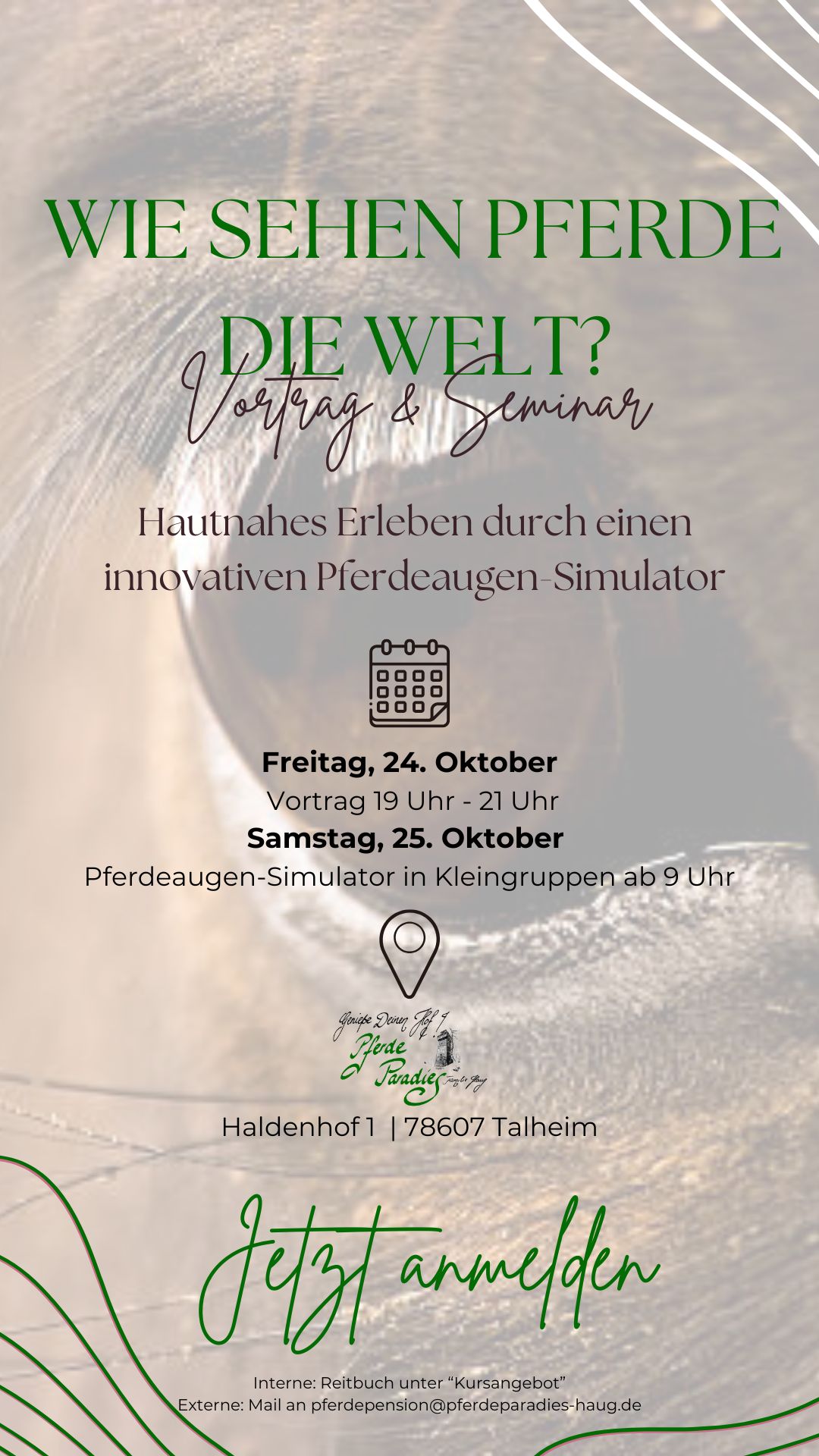 Oktober – 24./25.10.Wie sehen Pferde die Welt – Vortrag & SeminarJede:n, sowohl interne als auch externe InteressierteInterne: Reitbuch – Kursangebot