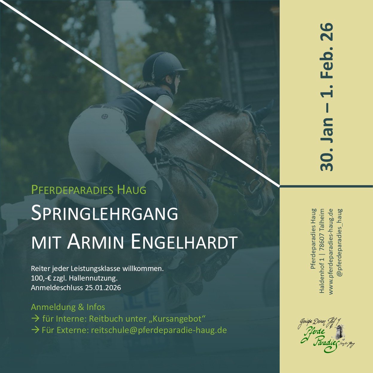 | 30.01. – 01.02. | Springlehrgang mit Armin Engelhardt | Privatpferdereiter:innen | Reitbuch – Kursangebot |