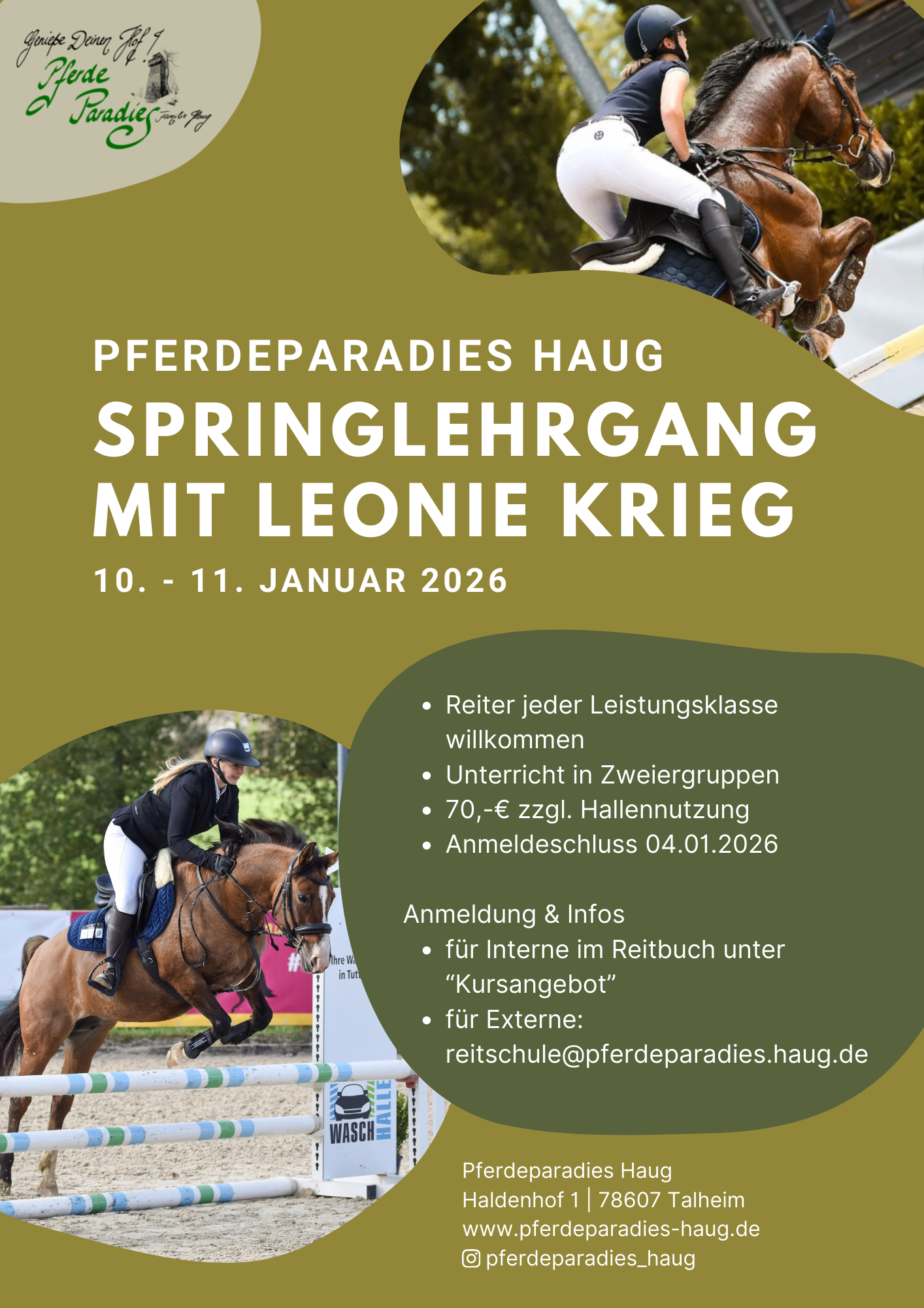 | Januar – 10. – 11.01. | Springlehrgang mit Leonie Krieg | Privatpferdereiter:innen | Reitbuch – Kursangebot |