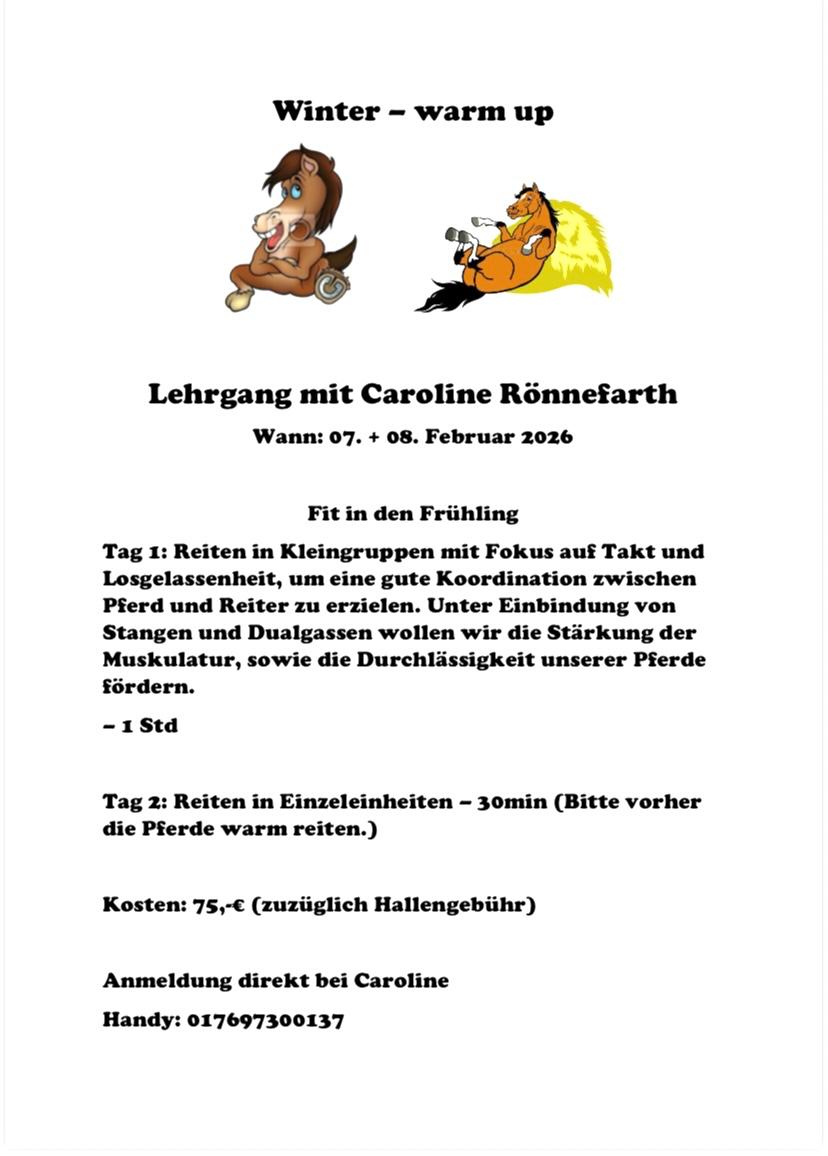 | Februar – 07.02.-08.02. | Lehrgang mit Caroline Rönnefarth | Privatpferdereiter:innen | Caroline Rönnefarth (0176 9730 0137) |
