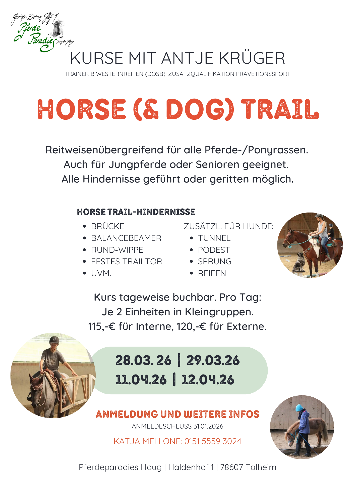 | 28.03. – 29.03 | Horse Trail Kurs mit Antje Krüger | Privatpferdereiter:innen | Katja Mellone (+49 1515 5593024) |