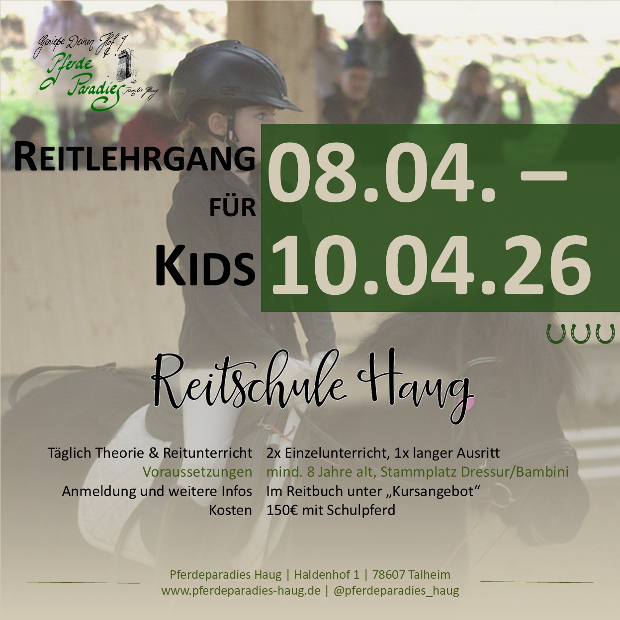 | 08.04. – 10.04. | Reitlehrgang für Kids | Reitschüler:innen | Reitbuch – Kursangebot |
