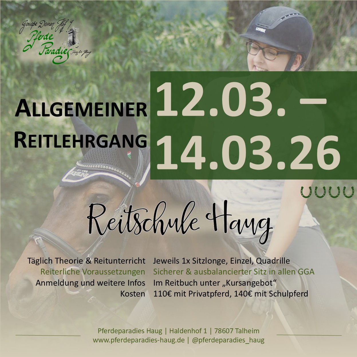 | März – 12. – 14.03. | Allgemeiner Reitlehrgang | Reitschüler:innen | Reitbuch – Kursangebot |