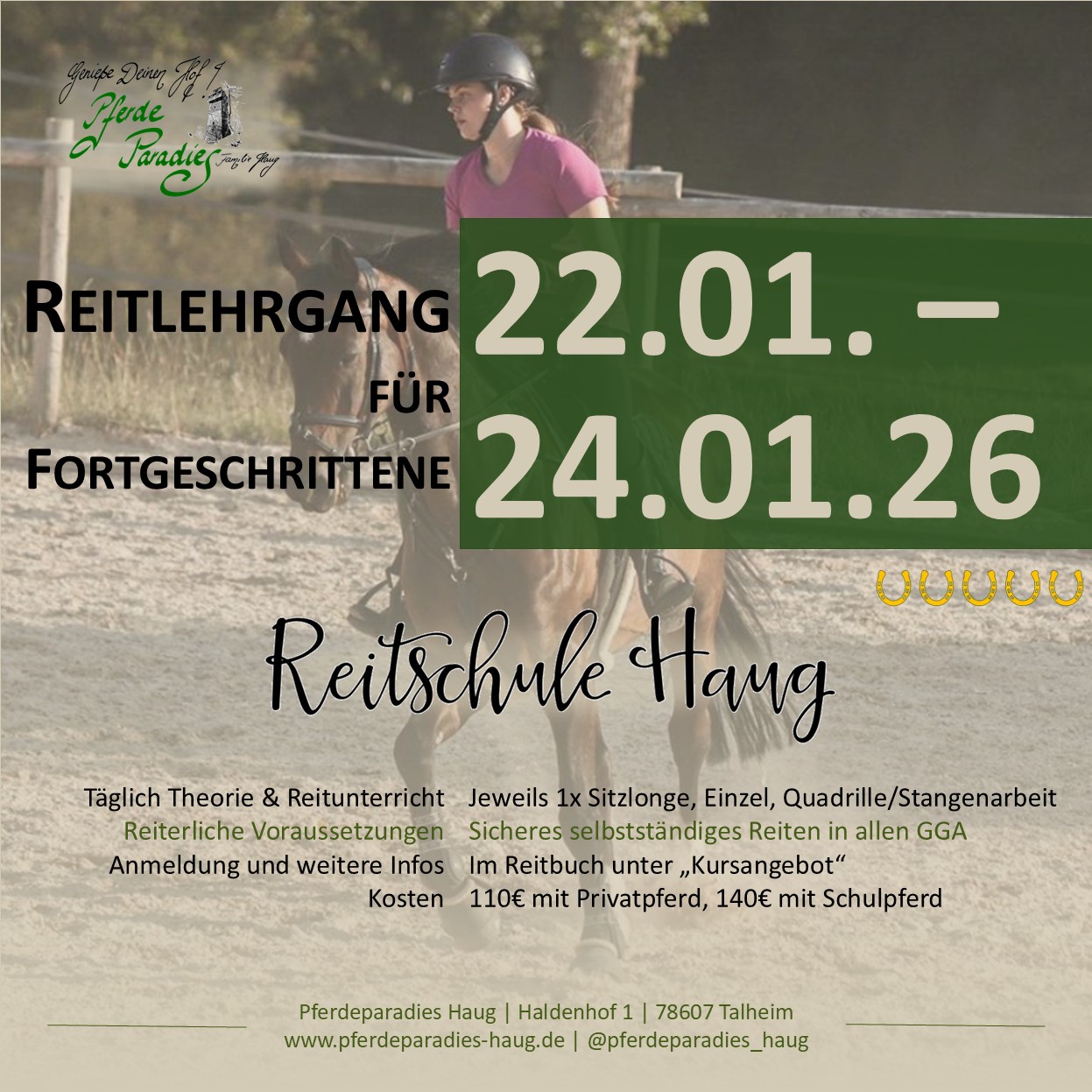 | 22.01. – 24.01. | Reitlehrgang für Fortgeschrittene | Reitschüler:innen | Reitbuch – Kursangebot |