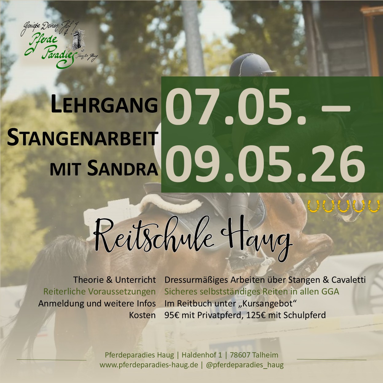 | Mai – 07.05. – 09.05. | Lehrgang Stangenarbeit mit Sandra | Reitschüler:innen | Reitbuch – Kursangebot |
